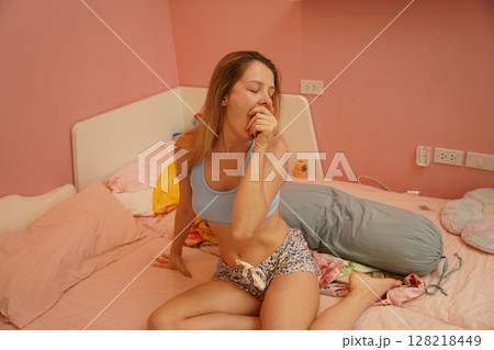 A young woman is enjoying a wonderfully serene morning in her bedroomnd