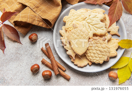 Autumn cookies on plate with cinnamon and hazelnuts
