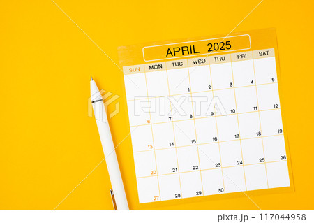 April 2025 Monthly calendar for 2025 year with pen on yellow background.