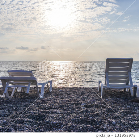 Set of white plastic patio chaise lounge at the beach