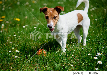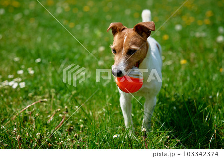 Active dog playing with toy ball on green grass at summer day. Pet walking in park. Jack Russell terrier portrait