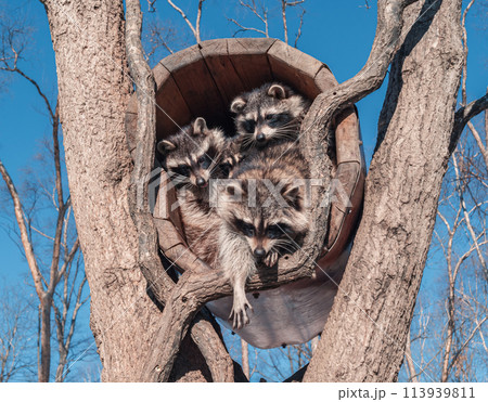A group of three raccoons is huddled inside the hollow of a tree, with one raccoon reaching out and the others looking on from within.
