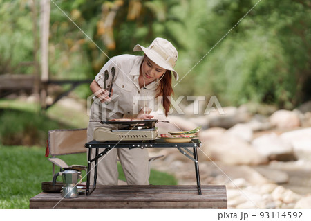 Asian woman journey and camping and making grill food. Travel outdoor activity lifestyle.