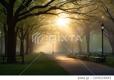 Beautiful public park with green grass field on morning light Created with Generative AI technology.