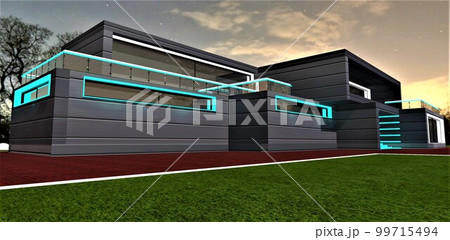 Upscale contemporary cottage at night finished with horizontal aluminum panels. Glowing window frames as an exterior decoration. 3d rendering.