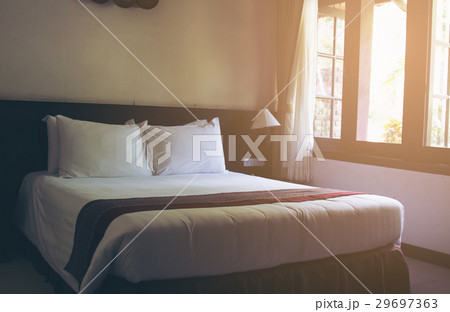 Rear view of happiness Asian woman open curtains for looking beautiful view outside her room.