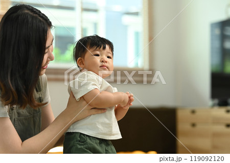 Asian mother teaching her little baby boy learning to walk on floor in cozy living room