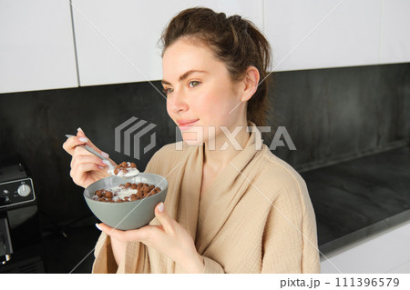Good-looking brunette woman eating her breakfast, standing in kitchen near worktop and holding bowl of cereals with milk, enjoying her morning, wearing cosy bathrobe