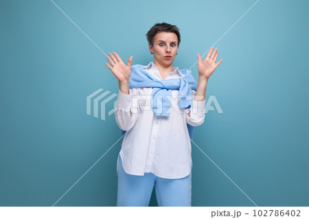 stylish blond middle-aged woman in a white blouse demonstrates something on a studio background with