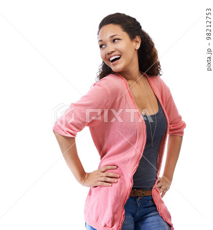 Shes got a casual confidence about her. High angle shot of a beautiful young woman standing against a white background.
