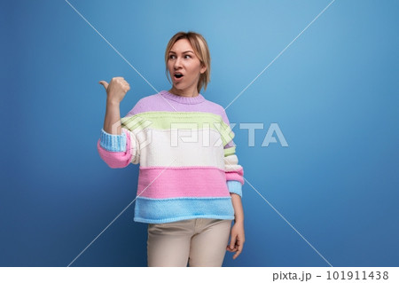 bright photo of a positive joyful happy blonde girl in a striped sweater on a blue background with