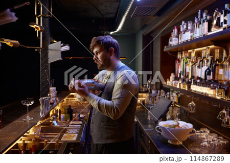 Bartender decorating pink cocktail with rose petal using tweezers
