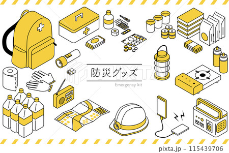 防災グッズ、非常食のシンプルな線画、アイソメトリックイラスト