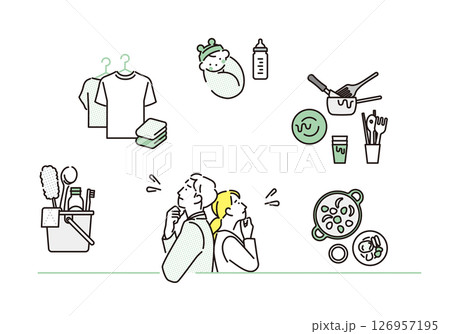 シンプル イラスト 仕事と家事育児に悩む夫婦のベクターイラスト