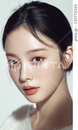 Beautiful Korean woman showcasing elegant makeup and hairstyle with soft lighting in a minimalistic setting