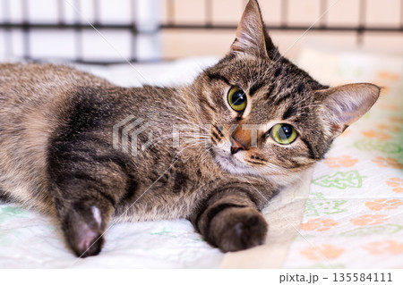 Calm tabby with soft paws, Serene striped cat enjoying restful time on cuddly surface