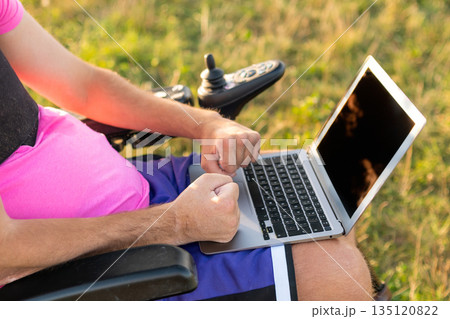 Man in wheelchair works on modern laptop holding device on lap in sunny meadow. Male freelancer enjoying business work via Internet in grassy meadow