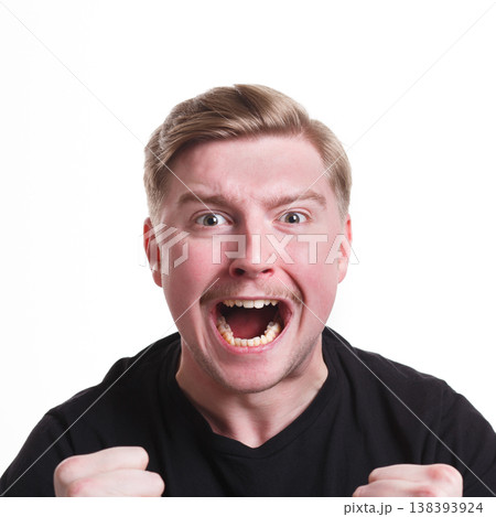 Winner celebrates. Great success. Excited man with happy facial expression shout on white isolated studio background