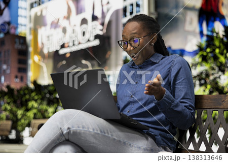 Laughing, laptop and jolly woman outdoors watching funny movie, having fun. Enjoying relaxation time, notebook and African american girl outside amused by hilarious comedy TV show