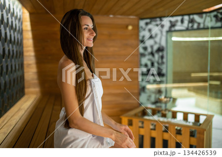 Smiling pretty long-haired woman in a towel sitting in sauna
