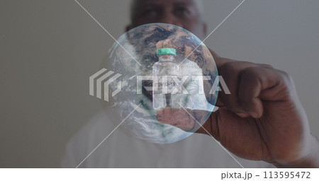 Spinning globe against portrait of male african american man holding covi-19 vaccine
