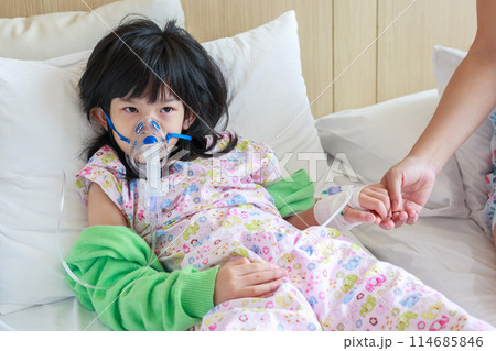 Sick little asian girl inhalation with nebulizer for respiratory treatment