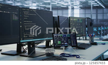 Data center facility employing deep learning technology to maintain company network infrastructure. Neural networks tech used in server room to ensure optimal system performance, handheld camera shot