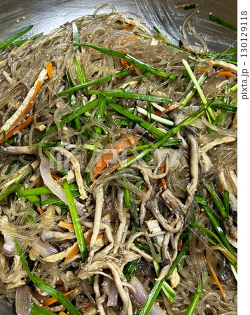 A vibrant plate of japchae featuring stir-fried glass noodles, colorful vegetables, and tender slices of meat, all coated in a savory-sweet soy-based sauce. A classic Korean favorite!