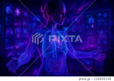 AI generated futuristic scan showing transparent female torso with glowing skeletal and respiratory system in blue holographic interface surrounded by advanced diagnostic screens in a sci-fi lab