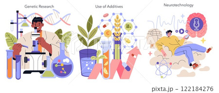 Biohacking set. Exploring human enhancement through genetic research, dietary additives, and neurotechnology. Health optimization and life extension. Vector illustration.
