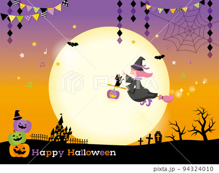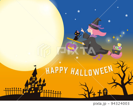 ハロウインに夜空を飛ぶかわいい黒猫と魔女