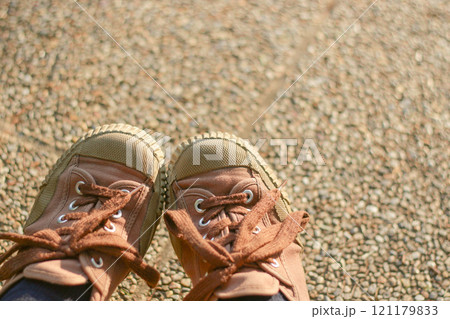 遊歩道で一休みするスニーカー - 子供靴のような可愛らしい足元