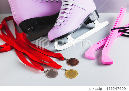 Figure skates, covers and three medals on a light background