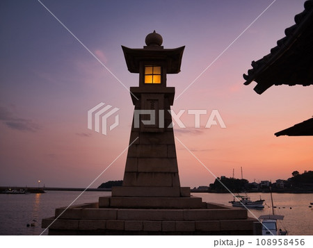 鞆浦の常夜灯に火が灯る黄昏時の海