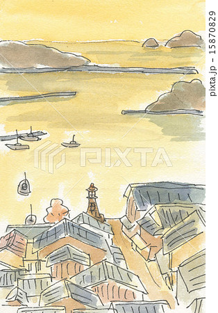 水彩画風 鞆の浦 港の眺望 広島県福山市