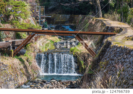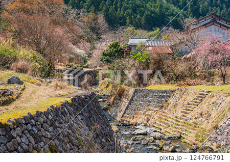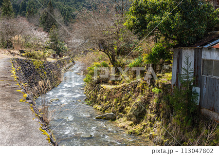 浅春の京都洛北鞍馬集落と鞍馬川の風景