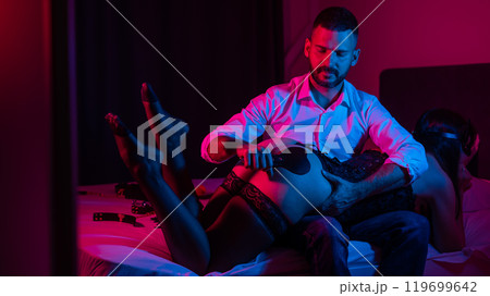 A man spanks a woman with a leather whip while sitting on a bed in neon light. bdsm.