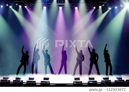 スポットライトのあたるステージで人差し指を突き上げてダンスする7人の男性シルエット