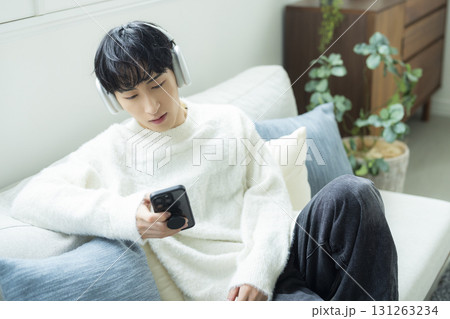 男性 スマホ ヘッドフォン リビング ライフスタイル
