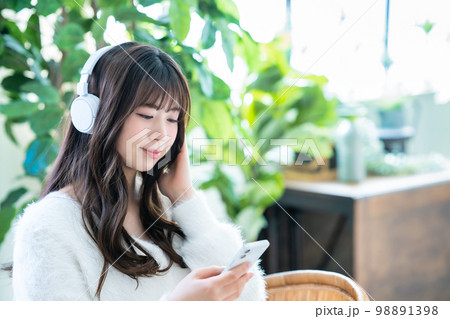 女性 スマホ ヘッドフォン ライフスタイル リビング