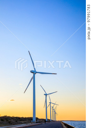 夕暮れ時の冬の響灘の風車 響灘北緑地公園 福岡県北九州市