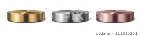 Gold, silver, bronze podiums. Cylindrical winners platform for awards or product display, empty 3d metal stages, champions pedestals. Vector isolated set