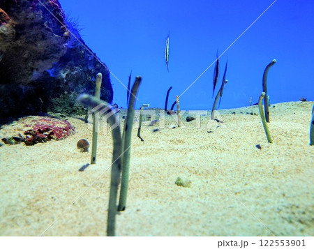 須磨シーワールド 顔を出して揺れるチンアナゴとニシキアナゴ