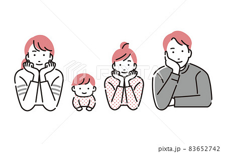 頬杖をつく笑顔の若い四人家族のフレーム シンプルでお洒落な線画イラスト