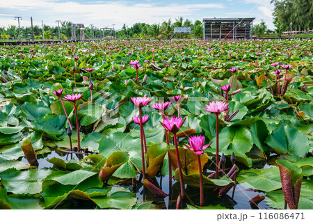 Pink color aquatic Lotus flower, Water Lily blooming and growing in the pond