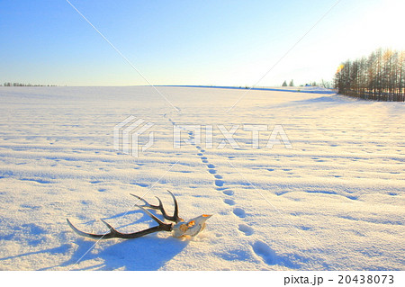 北海道の大自然 エゾ鹿の骸骨と角と雪原とキタキツネの足跡と太陽
