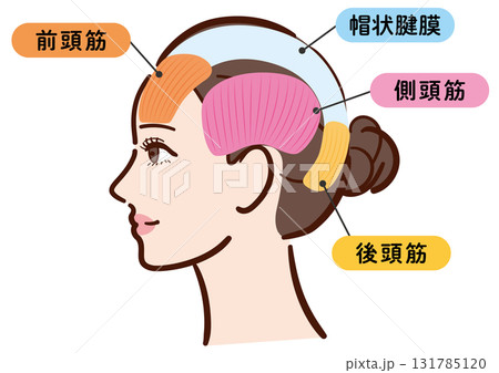 若い女性の横顔 頭部の筋肉の図解イラスト(名称入り・カラフル)