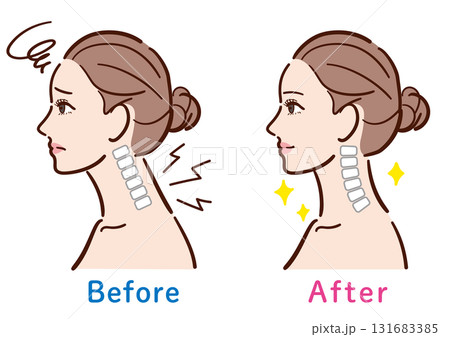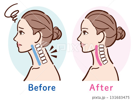 ストレートネックから正常な状態への変化イラスト(女性横顔)