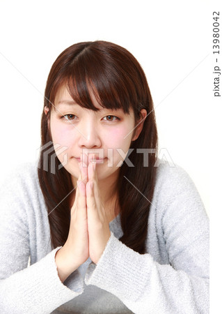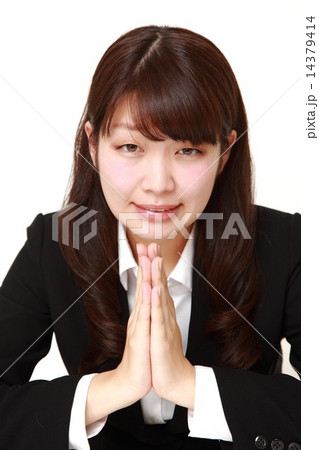 手を合わせてお願い事をするベージュのスーツを着たミドル女性