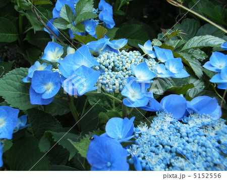 装飾花が青色の額咲きのアジサイの花序をクローズアップした写真